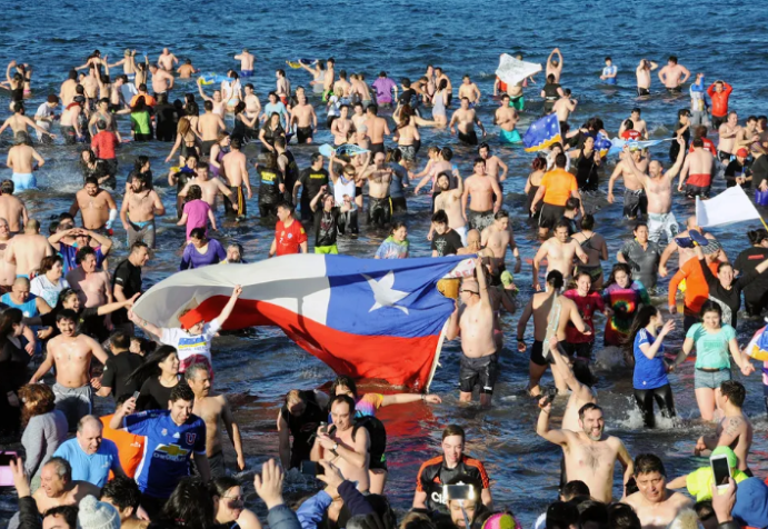 Una de las tradiciones más extremas de las Invernadas, donde valientes participantes se sumergen en las gélidas aguas del Estrecho de Magallanes para desafiar el frío.